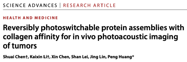 近日,深圳大学医学部生物医学工程学院黄鹏特聘教授团队在国际顶级学术期《Science Advances》(影响因子11.7,中科院一区,TOP期刊)上发表了题为《Reversibly photoswitchable protein assemblies with collagen affinity for in vivo photoacoustic imaging of tumors》的研究论文。该研究的所有工作均在深圳大学完成,该团队副研究员陈帅、研究生黎开心为论文共同第一作者,黄鹏教授为唯一通讯作者,深圳大学为唯一通讯单位,该团队所在的生物医学工程学科属于广东省优势重点学科。