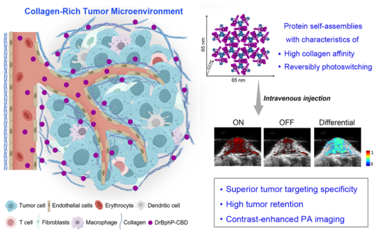 可逆光开关蛋白探针的光致变色特性有助于消除多余的背景噪声,尤其适用于深部肿瘤PA成像。该团队通过AlphaFold成功开发了一种基于可逆光开关蛋白的组装体(DrBphP-CBD),该蛋白通过将极端嗜辐射菌(Deinococcus radiodurans)中的光敏模块(DrBphP)与胶原结合域(CBD)进行基因融合并制备。这些蛋白组装体的尺寸在100纳米左右,由24个DrBphP二聚体和12个CBD三聚体组成,展示出24个蛋白亚基。该纳米组装体对胶原具有强亲和力,以及显著的光开关对比度,极大地提升了PA成像的对比度。在多种小鼠肿瘤模型中,通过静脉注射DrBphP-CBD,该组装体展现出优异的肿瘤靶向性,并表现出较长的肿瘤滞留时间。通过背景抑制PA成像技术,大大地减少了背景的噪音,显著地提高了PA成像的对比度。研究结果表明DrBphP-CBD作为光声对比剂展现出的高特异性和优越的光开关对比度,有望在未来的临床应用中提升光声成像技术的诊断精度,推动癌症早期检测和治疗监测的进一步发展。