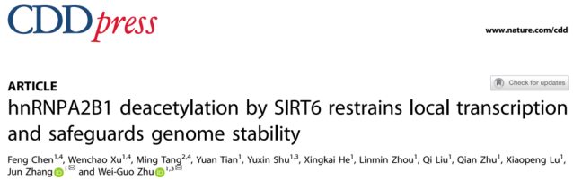 2024年11月,深圳大学医学部卡尔森国际肿瘤中心朱卫国特聘教授团队在《Cell Death & Differentiation》(影响因子12.4,TOP期刊,中科院一区)发表题为“hnRNPA2B1 deacetylation by SIRT6 restrains local transcription and safeguards genome stability”的研究论文,阐明了RNA结合蛋白hnRNPA2B1的去乙酰化修饰对于DNA损伤时局部转录抑制以及基因组稳定性的维持起到至关重要的作用。博士研究生陈凤,硕士研究生许文超为本研究共同第一作者,医学部张俊助理教授和朱卫国特聘教授为本文共同通讯作者。