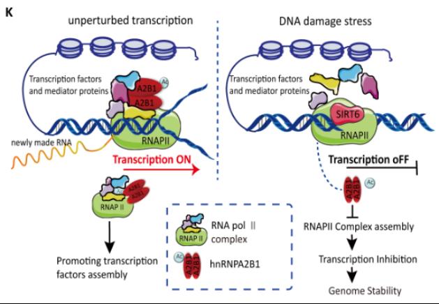 本研究揭示了RNA结合蛋白hnRNPA2B1作为一个关键的转录相关因子在正常情况下对于维持转录复合物的稳定性至关重要。然而,当DNA损伤发生时,hnRNPA2B1会脱离损伤位点,并进一步降低RNA聚合酶Ⅱ复合物的组装效率,从而导致局部的转录抑制。机制上,该团队鉴定出SIRT6使hnRNPA2B1在K113/173残基上发生去乙酰化使其快速脱离DNA损伤位点,这一行为破坏了活跃染色质上RNA聚合酶Ⅱ复合物的完整性。功能研究显示,hnRNPA2B1去乙酰化或缺失有利于DSB修复,且乙酰化模拟物对基因毒性疗法更加敏感。这一事实提示可以通过抑制SIRT6活性来减少hnRNPA2B1在DNA损伤位点的脱离以增强某些特定肿瘤细胞对放化疗的敏感性。这一研究结果为深入理解转录抑制在基因组稳定性维持过程中的具体机制提供了新思路,并为探索针对hnRNPA2B1异常表达癌症的治疗提供了潜在新策略(具体工作模式图如下)。