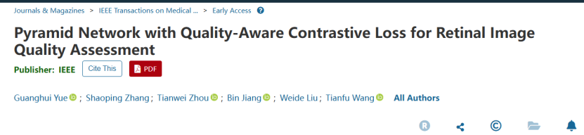 近日,深圳大学医学部岳广辉副教授在医学图像处理领域顶级期刊IEEE Transactions on Medical Imaging (TOP期刊,中科院一区,IF=8.9)上发表题为“Pyramid Network with Quality-Aware Contrastive Loss for Retinal Image Quality Assessment”的学术论文。青年教师岳广辉副教授担任第一作者,研究生张绍萍为第二作者。深圳大学为第一作者单位和通讯单位。